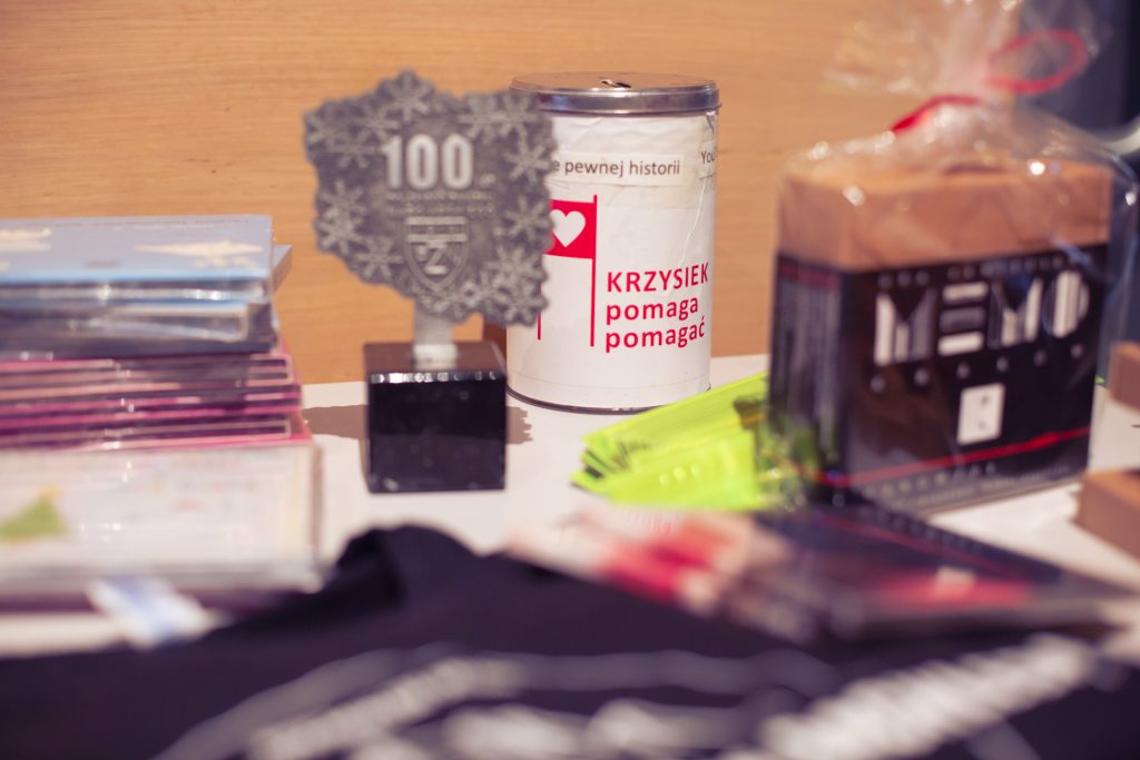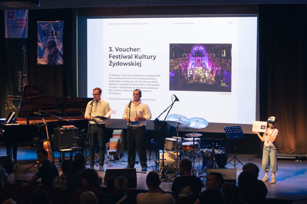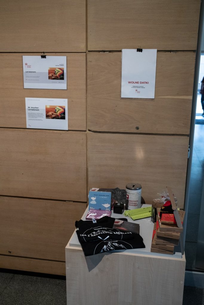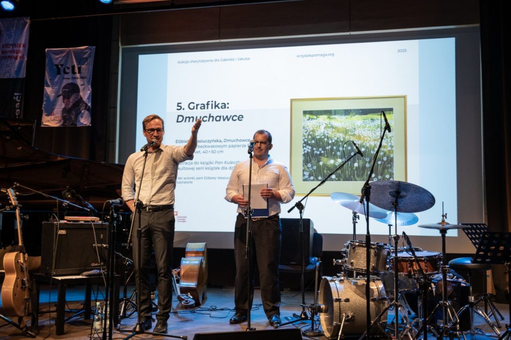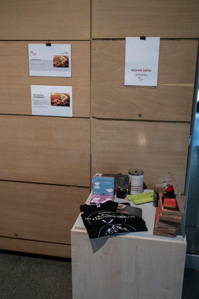Goście przechadzający się po foyer mogli nasycić oczy wystawą przedmiotów aukcyjnych, a żołądki i kubki smakowe – przekąskami z restauracji Cheder, ciasteczkami z piekarni Buczek, nalewkami od Mundivie oraz winami od NaWino. Nie potrafimy zmierzyć, jak to wpłynęło na hojność licytujących, ale z pewnością wiemy, że licytowano wysoko – z pożytkiem dla Gabriela i Jakuba.